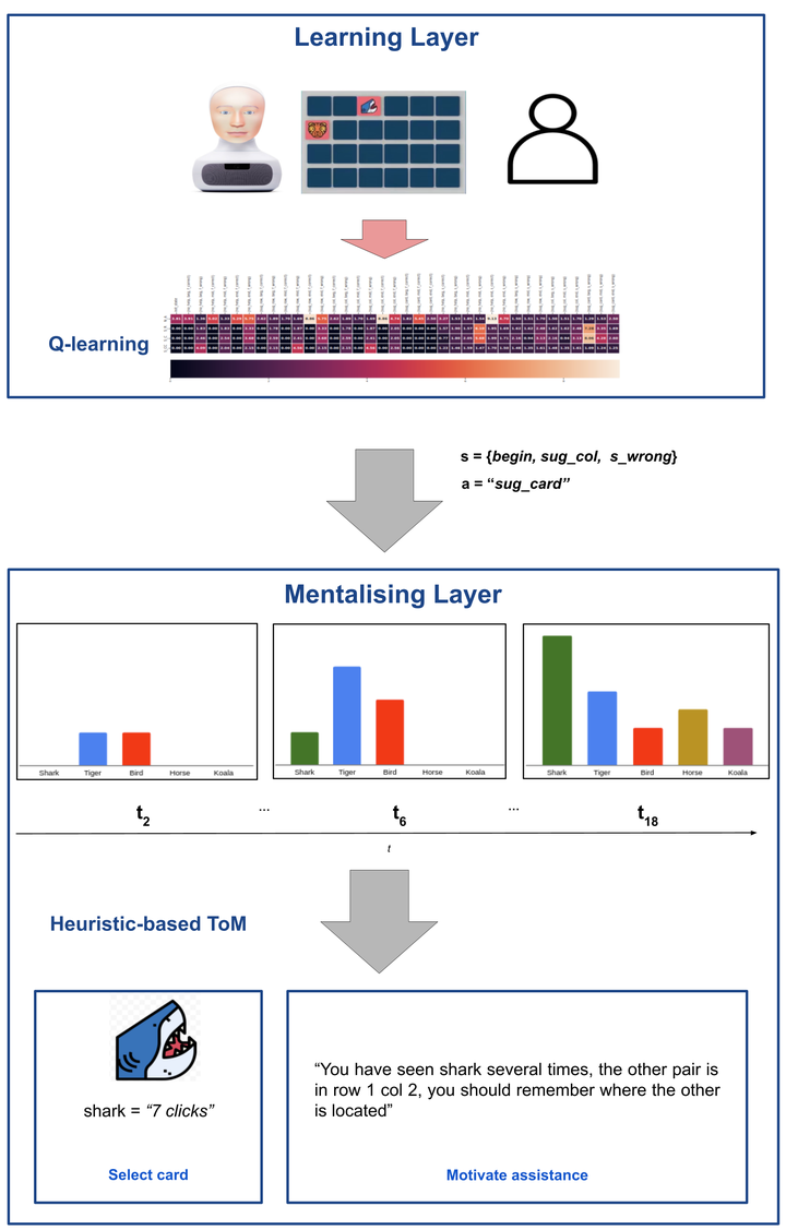 Adaptation to user preferences and the ability to infer and interpret human beliefs and intents, known as the Theory of Mind (ToM), are two critical aspects of effective human-robot collaboration. Despite their importance, very few studies have investigated the impact of adaptive robots with ToM capabilities. This work presents an exploratory comparative study to investigate how social robots simulating ToM capabilities affect user performance and perception. We design a two-tier architecture. The Q-learning agent on the first layer learns the robot’s higher-level behaviour. On the second layer, a heuristic-based ToM infers the user’s intended strategy and is responsible for implementing the robot’s assistance, as well as providing the motivation behind its choice. We conducted a user study in a real-world setting, involving 56 participants who interacted with either an adaptive robot simulating ToM capabilities, or with a robot lacking such capabilities. Our results suggest that participants in the ToM condition performed better, accepted the robot’s assistance more often, and perceived its ability to adapt, predict and detect their intentions to a greater extent. Our preliminary findings could inform future research and pave the way for the design of robot architectures for adaptive behaviour with ToM capabilities, where the choice of action is decoupled from its implementation.