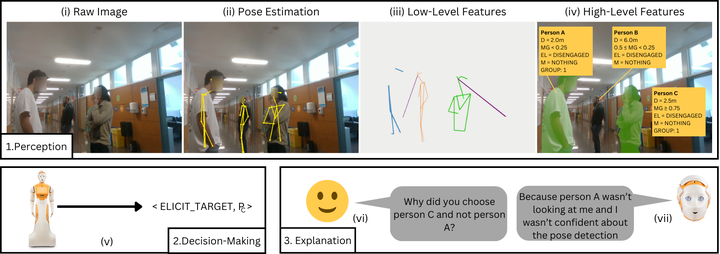 For social robots to be able to operate in unstructured public spaces, they need to be able to gauge complex factors such as human-robot engagement and inter-person social groups, and be able to decide how and with whom to interact. Additionally, such robots should be able to explain their decisions after the fact, to improve accountability and confidence in their behavior. To address this, we present a two-layered proactive system that extracts high-level social features from low-level perceptions and uses these features to make high-level decisions regarding the initiation and maintenance of human-robot interactions. With this system outlined, the primary focus of this work is then a novel method to generate counterfactual explanations in response to a variety of contrastive queries. We provide an early proof of concept to illustrate how these explanations can be generated by leveraging the two-layer system.