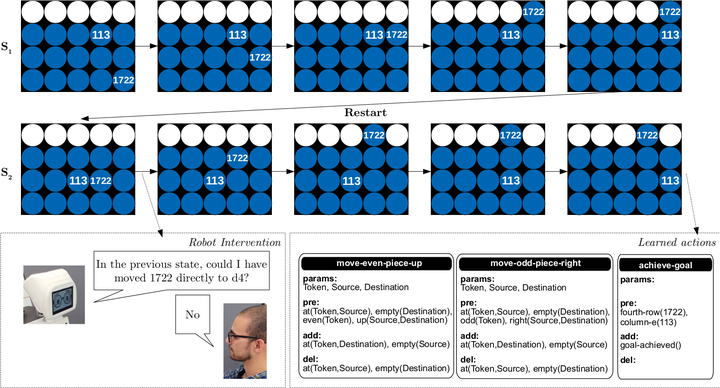 Enabling a robot to perform new tasks is a complex endeavor, usually beyond the reach of non-technical users. For this reason, research efforts that aim at empowering end-users to teach robots new abilities using intuitive modes of interaction are valuable.In this article, we present INtuitive PROgramming 2 (INPRO2), a learning framework that allows inferring planning actions from demonstrations given by a human teacher. INPRO2 operates in an assistive scenario, in which the robot may learn from a healthcare professional (a therapist or caregiver) new cognitive exercises that can be later administered to patients with cognitive impairment. INPRO2 features significant improvements over previous work, namely: (1) exploitation of negative examples; (2) proactive interaction with the teacher to ask questions about the legality of certain movements; and (3) learning goals in addition to legal actions. Through simulations, we show the performance of different proactive strategies for gathering negative examples. Real-world experiments with human teachers and a TIAGo robot are also presented to qualitatively illustrate INPRO2.
